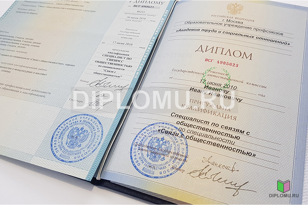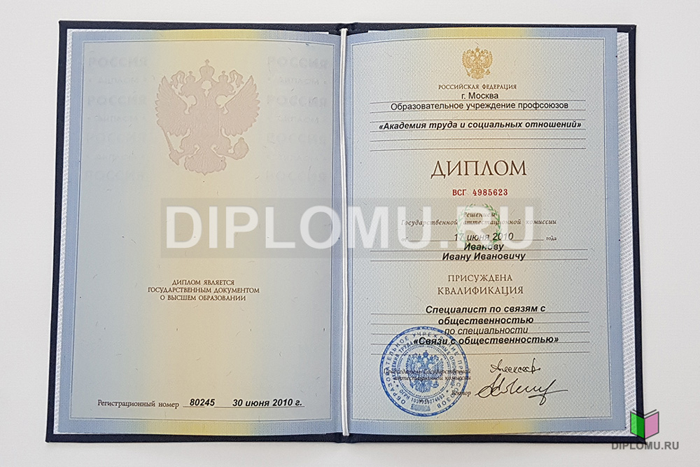 На нашем сайте Вы можете купить диплом об окончании любого ВУЗа России в 2010 или 2011 году. Ниже представлены фото и цена такого документа. Наши специалисты заполнят диплом по всем правилам, установленным Министерством образования и науки РФ. Заверяются «мокрыми» печатями и нужными подписями.